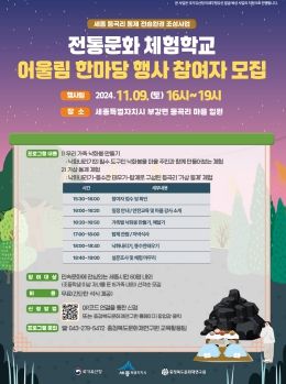 [경남도민뉴스=도문호 기자] 세종특별자치시가 전통문화체험학교 ‘어울림 한마당’ 프로그램에 참여할 가족을 오는 8일까지 선착순 모집한다.
