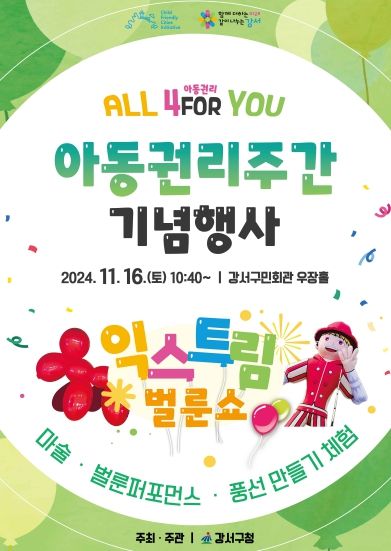 기념행사는 오는 16일 오전 10시 40분부터 12시까지 강서구민회관 우장홀에서 열리며 ▲아동학대예방 캠페인 ▲아동권리교육 영상 시청 ▲개회식 ▲기념공연 등이 진행된다.