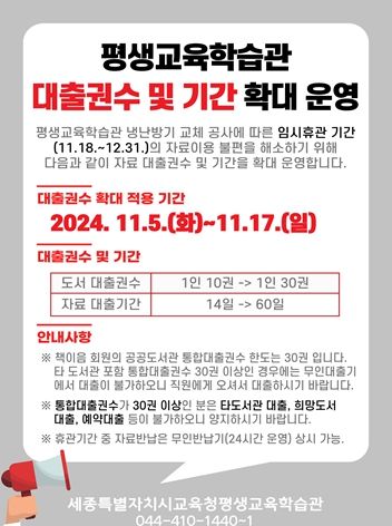 휴관 중 이용자들의 독서 공백을 최소화하기 위해 오는 11월 5일부터 11월 17일까지 ‘대출 확대 서비스(1인 10권 → 30권, 대출 기간 14일 → 60일) 및 전자책 서비스’를 운영할 방침이다.