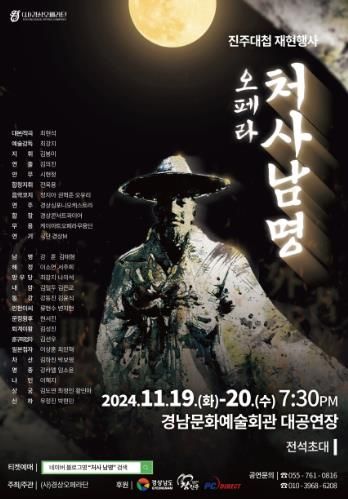 경상국립대 음악교육과 최강지 교수가 예술감독을 맡고, 경상오페라단이 주관한 ‘처사 남명’은 2023년에 이어 올해에도 ‘경상남도 지역대표공연예술제 지원사업’에 선정됐다.