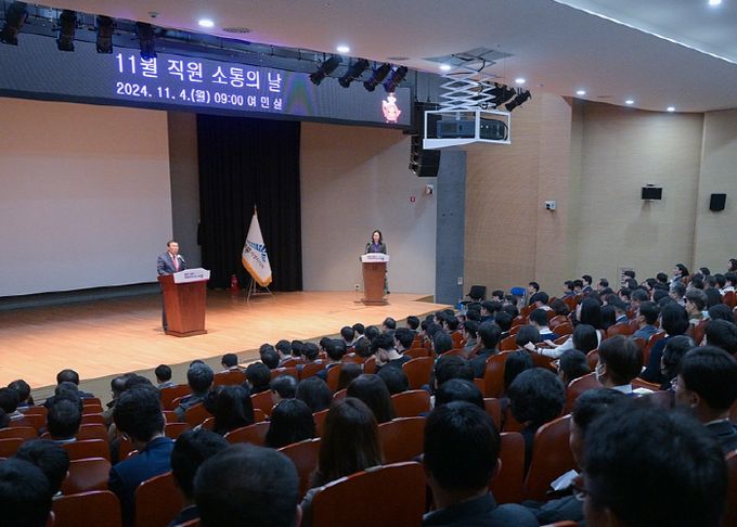 [경남도민뉴스=도문호 기자] 최민호 세종특별자치시장이 4일 시청 여민실에서 열린 11월 직원 소통의 날에 참석해 전국적으로 재정이 어려운 상황이지만 도시의 미래를 위한 사업은 반드시 해내야 한다고 역설했다.