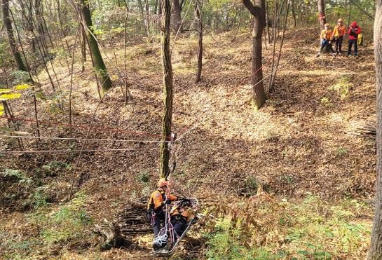 훈련과정은 실제 사고 상황을 가정해 ▲산악사고 발생 시 초기 대응 절차 ▲구조장비와 인명 구조 기술 숙달 ▲위치추적장치(GPS)와 국가지점번호로 정확한 위치 확인 및 구조대원 간 위치 공유 ▲소방드론을 활용한 인명검색 및 응급처치와 이송 절차 등으로 진행됐다.