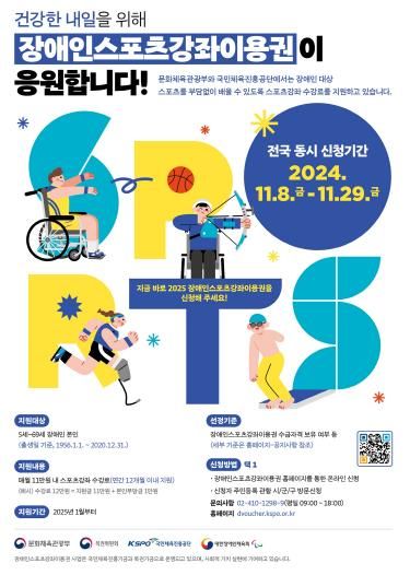 신청 대상은 5~69세(1956~2020년 출생자) 장애인이며, 신청 기간과 방법은 저소득층 아동‧청소년 스포츠강좌이용권과 동일하다.
