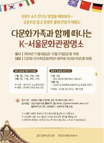 이번 프로그램은 다문화 가정의 부모와 자녀가 한국의 역사와 문화를 배우고, 한국 사회에 쉽게 융화될 수 있도록 돕기 위해 금천구립독산도서관에서 기획했다. 국내 명소를 다녀보는 ‘온라인 수업’과 직접 전통문화 체험을 해볼 수 있는 ‘대면 수업’을 병행해 진행된다.