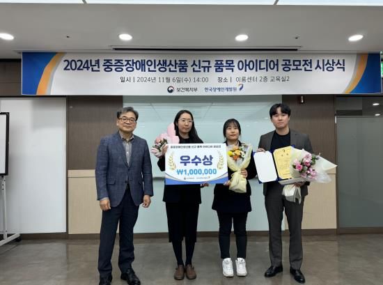 보건복지부에서 주관하는"2024년 중증장애인생산품 신규 품목 아이디어 공모전"은 4차 산업혁명 시대의 흐름에 따라 중증장애인생산품 유망 품목을 발굴하고 우수기관을 포상하기 위해 매년 개최되고 있다. 올해는 총 5개 기관 및 개인이 우수 아이디어로 선정되었으며 공단은 우수상을 수상하여 한국장애인개발원장상을 받았다.