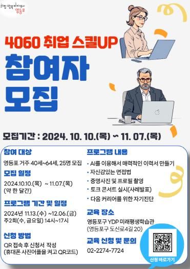 ‘4060 취업 스킬 UP’에 참여하고자 하는 구민은 홍보 포스터 내의 정보무늬(QR코드) 혹은 구 누리집의 ‘우리 구 소식’ 게시글 내 링크를 통해 신청할 수 있다.