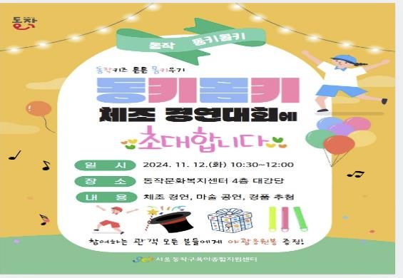 [경남도민뉴스=윤장희 기자] 동작구가 오는 12일 영유아의 건강한 신체 발달을 위해 ‘동키몸키 체조 경연대회’를 개최한다고 7일 밝혔다.