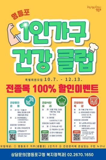 ‘영등포 1인가구 건강 클럽’ 프로그램은 모두 무료로 진행되며, 자세한 사항은 구청 복지정책과로 문의하면 안내받을 수 있다.