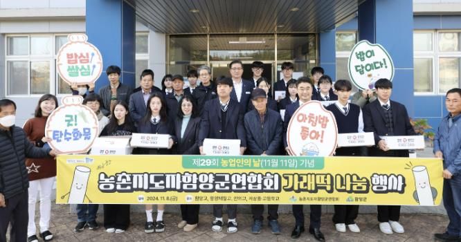 함양군 농촌지도자회는 2012년부터 매년 농약빈병 수거 및 공동학습포 수확을 통해 마련된 기금 등으로 가래떡을 준비해 관내 고등학교를 찾아가 11월 11일이 농업인의 날이라는 사실과 우리 농업·농촌의 소중함 및 우리 쌀의 우수성을 학생들에게 알렸다.