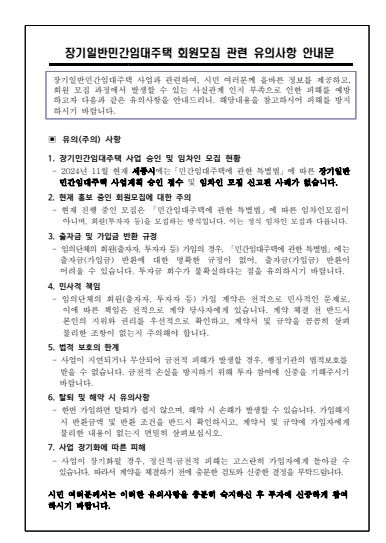 이두희 도시주택국장은 “임의 단체 회원, 출자자나 투자자 가입 계약은 당사자 간의 민사적인 문제이므로 피해 발생 시 피해 구제가 어렵다”며 “계약서상 본인의 지위, 계약금 반환 조건 등을 꼼꼼히 확인하고 임대주택에 대한 예비임차인 모집과 관련한 회원제 가입에 각별한 주의를 기울일 것을 거듭 당부한다”고 말했다.