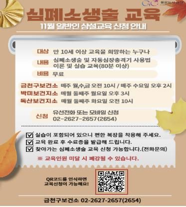 모든 교육은 무료로 제공된다. 교육 일정은 금천구청 보건소 누리집에서 확인할 수 있으며, 온라인 또는 유선으로 신청하면 된다.