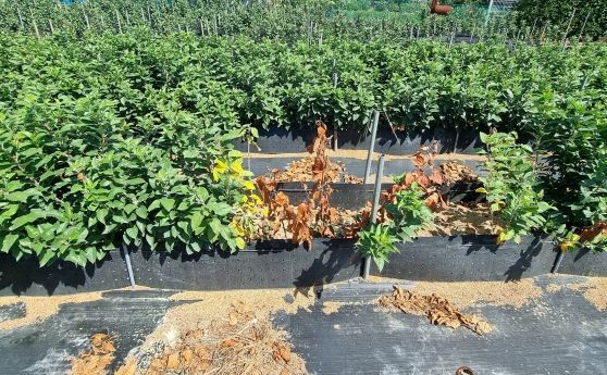 경상북도농업기술원은 올해 5월~10월 경산 묘목 특구 내 사과 대목 생산지에서 줄기가 말라 죽는 피해가 나타나 이를 조사한 결과 줄기 집단 마름증상의 주원인은 흰비단병(Athelia rolfsii)임을 밝혀냈다.