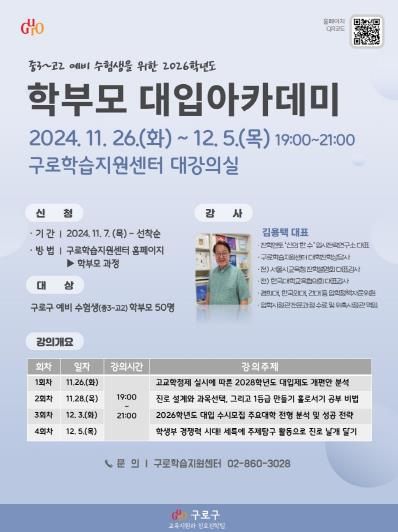 [경남도민뉴스=윤장희 기자] 구로구가 예비 수험생 학부모를 대상으로 한 ‘2026학년도 학부모 대입 아카데미’를 운영한다.
