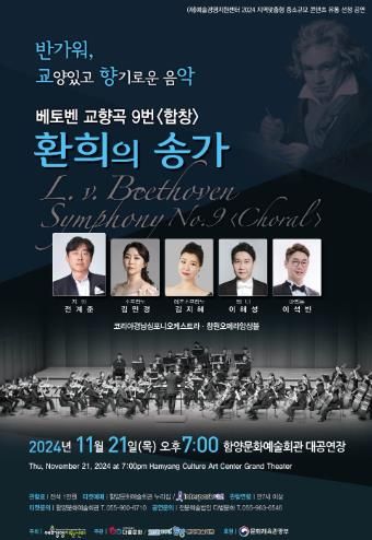 [경남도민뉴스=장광동 기자] ㈜다볕이 주관하는 ‘반가워! 교양있고 향기로운 음악’ 베토벤 교향곡 9번 '합창' 환희의 송가 공연이 오는 11월 21 오후 7시 함양군문화예술회관 대공연장에서 열린다.