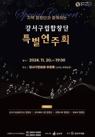 행사에는 강서구립합창단을 포함해 은행나무합창단, 강서구상공회CEO합창단, 푸르미 합창단, 강서에버그린합창단이 참여한다.