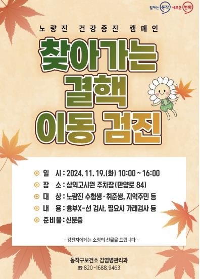 [경남도민뉴스=윤장희 기자] 동작구는 학원, 고시원 등 전파 위험이 큰 청년 집단시설을 중심으로 오는 19일 ‘찾아가는 결핵 이동검진’을 실시한다고 밝혔다.
