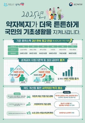 이에 따라 2025년 월 생계급여는 1인 가구 5만 2천 원, 4인 가구 11만 7천 원 인상돼 복지 사각지대 해소와 저소득층의 생활개선에 큰 도움이 될 전망이다.