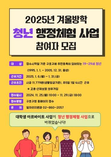 구로구 관계자는 “참여 대상 확대를 통해 취업을 준비하는 청년들이 공공기관의 다양한 행정 업무를 직접 체험할 기회를 제공하게 됐다”라며, “청년들이 구정에 참여해 실무 역량을 키울 수 있도록 지원을 아끼지 않겠다”라고 전했다.