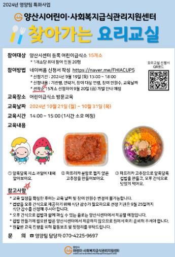 [경남도민뉴스=최미정 기자] 양산시 어린이사회복지급식관리지원센터는 지난 10월 센터에 등록된 기관의 어린이를 대상으로 [찾아가는 요리교실] 특화사업을 진행했으며, 11월 10일까지 가정 연계 사진 이벤트를 진행했다고 밝혔다.
