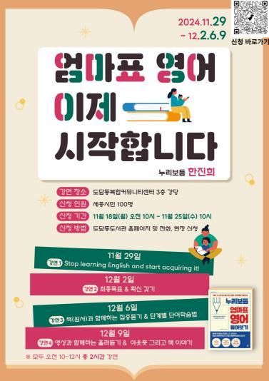 [경남도민뉴스=도문호 기자] 세종시립도서관 도담동도서관이 높아진 영어교육 수요에 부응하기 위해 ‘엄마표 영어, 이제 시작합니다’를 주제로 강연을 연다.