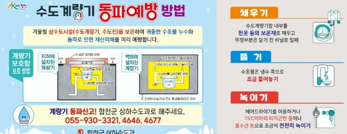 [경남도민뉴스=김춘호 기자] 합천군은 11월 15일부터 2025년 3월 15일까지 ‘동절기 한파 대비 수도계량기 동파사고 예방대책’을 추진한다고 밝혔다.