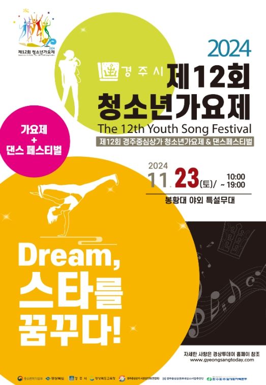 [경남도민뉴스=이돈휘 기자] 경주시가 중심상권에 활력을 불어넣기 위해 오는 23일 봉황대 특설무대에서 '제12회 청소년 가요제 · 댄스페스티벌'을 '2024 경주시 청소년 어울림마당'과 함께 진행한다.
