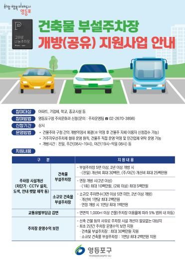 [경남도민뉴스=윤장희 기자] 영등포구가 지역 사회의 주차난 해소와 나눔 문화 확산을 위해 ‘부설주차장 개방 지원사업’에 참여할 건물주를 상시 모집한다고 밝혔다.
