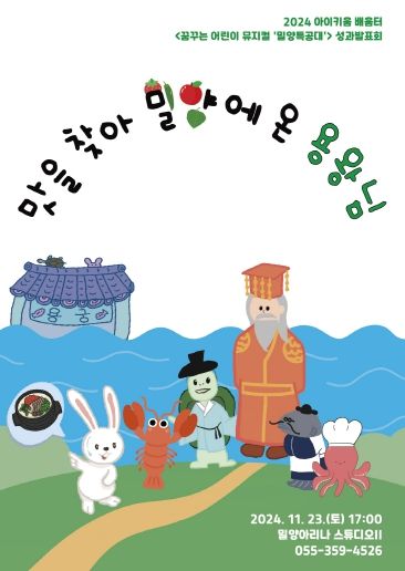 [경남도민뉴스=나희준 기자] 밀양문화관광재단은 오는 23일 오후 5시 밀양아리나 스튜디오Ⅱ 극장에서‘꿈꾸는 어린이 뮤지컬; 밀양특공대’성과발표회인‘맛을 찾아 밀양에 온 용왕님’을 선보인다.