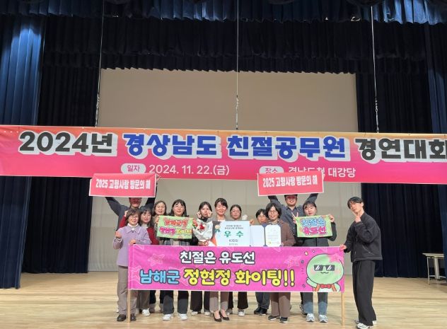 [경남도민뉴스=김부경 기자] 남해군이 지난 22일 경상남도청 신관 대강당에서 열린 ‘2024년 경상남도 친절공무원 경연대회’에서 우수상을 수상했다.