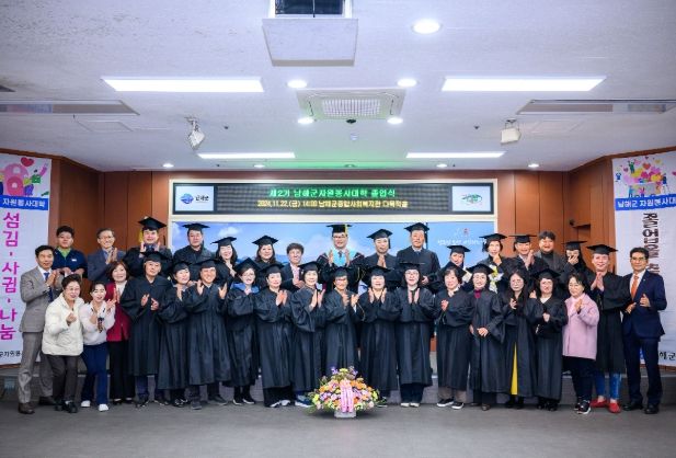 [경남도민뉴스=김부경 기자] 남해군은 지난 22일 종합사복지관 다목적홀에서 남해군 자원봉사대학장 장충남 군수, 정영란 군의회 의장, 제1기 자원봉사대학 졸업생 등 45여 명이 참석한 가운데 제2기 남해군 자원봉사대학 졸업식을 개최했다.