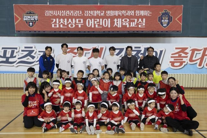 김천상무는 김천 관내 어린이들에게 건강한 신체발달과 사회성 및 협동심을 기르는 시간을 제공하고자 올해부터 어린이 체육교실을 운영했다. 특별히 사회공헌활동을 통해 지역 사회 단합의 장을 마련하고자 김천시시설관리공단(이사장 김재광), 김천대학교(총장 윤옥현)와 구단이 양해각서(MOU)를 체결하고 행사를 계획했다.