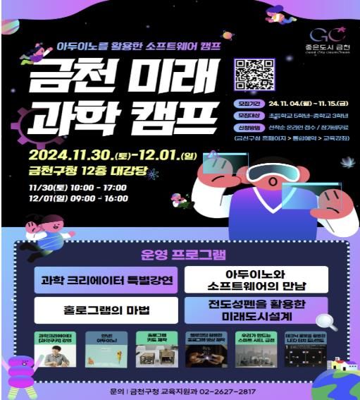 [경남도민뉴스=윤장희 기자] 금천구는 오는 11월 30일부터 12월 1일까지 이틀간 금천구청 12층 대강당에서 지역 초중등생 60명을 대상으로 ‘금천미래과학캠프’를 운영한다고 밝혔다.