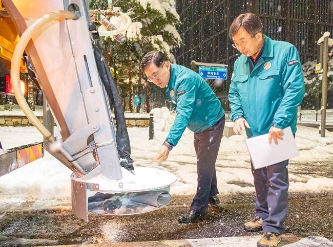 새벽부터 현장을 찾은 진 구청장은 폭설로 인한 주민 피해상황, 시간대별 적설량, 염화칼슘, 소금과 같은 제설자재 비축 현황 등 제설상황을 보고받은 뒤 도로의 결빙상태를 살폈다.