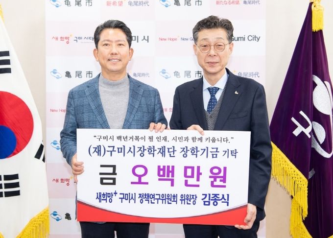 [경남도민뉴스=이돈휘 기자] (재)구미시장학재단은 지난 27일 구미시청 시장 집무실에서 새희망+ 구미시 정책연구위원회 김종식 위원장으로부터 500만 원의 장학기금을 기탁 받았다.