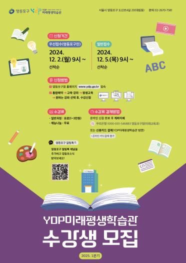 [경남도민뉴스=윤장희 기자] 영등포구가 구민의 배움과 성장을 지원하기 위해 YDP미래평생학습관에서 2025년 1분기 평생학습 강좌 수강생을 모집한다고 밝혔다.