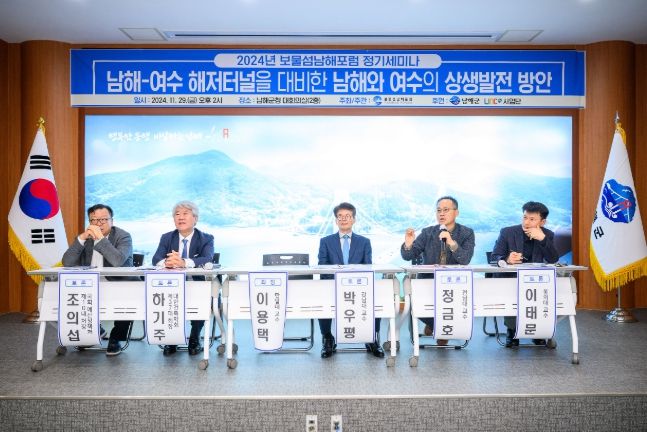 [경남도민뉴스=김부경 기자] 남해군 출신 교수, 연구원, 기업가 등 분야별 전문가들로 구성된 ‘보물섬 남해포럼(대표 이용택 한밭대학교 교수)’이 지난 11월 29일 오후 남해군청 대회의실에서 ‘남해∼여수 해저터널 개통을 대비한 남해와 여수의 상생발전 방안’이라는 주제로 정기세미나를 개최했다.