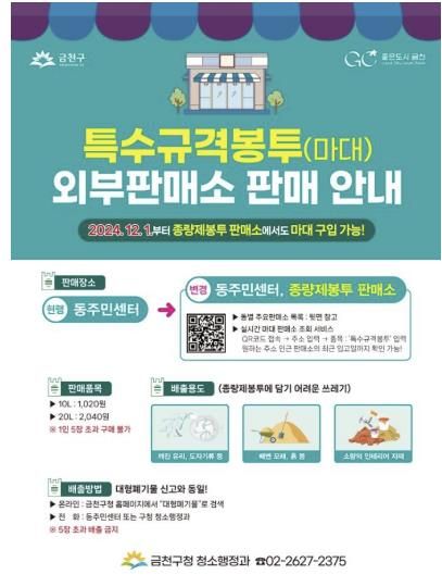 [경남도민뉴스=윤장희 기자] 금천구가 이번 달 1일부터 특수규격봉투(마대)를 종량제봉투 지정판매소로 확대해 판매한다고 밝혔다.