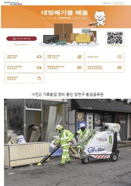 구는 대형폐기물 배출 편의 개선과 함께 수거 처리의 편의성도 높였다. 수거자(폐기물 수거 대행업체) 전용 앱을 구축해 배출 신고 즉시 실시간지도(네비게이션)로 연계되어 수거원이 신속하고 정확하게 수거할 수 있도록 했다.