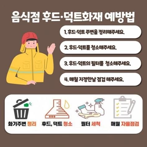 이와 더불어, 매월 정해진 날에 후드와 덕트의 상태를 점검하는 습관을 들이는 것이 필요하다. 자율점검을 통해 이상 여부를 미리 확인하고, 필요한 경우 전문 업체의 도움을 받아 점검과 관리를 철저히 하는 것이 화재를 예방하는 데 큰 도움이 된다.