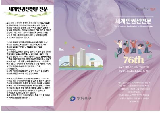[경남도민뉴스=윤장희 기자] 영등포구가 12월 9일부터 13일까지 5일간 세계 인권선언의 날 76주년을 기념해, 지역 사회의 인권 존중 문화를 확산하기 위한 ‘세계 인권선언의 날 캠페인’을 개최한다고 밝혔다.