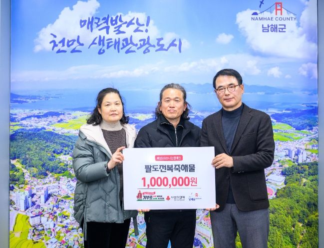 [경남도민뉴스=김부경 기자] 미조면 소재 ‘팔도전복죽해물’ 안소영·김경섭 대표가 9일 남해군청을 방문하여 성금 100만원을 기탁했다.