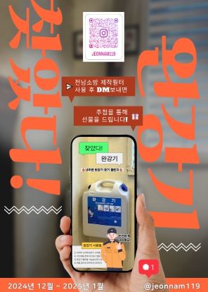 참여방법은 주변에 설치된 완강기를 찾아 전남소방에서 제작한 AR필터를 활용하여 사진을 찍은 다음 전남소방으로 메시지(DM)를 보내면 참여 완료된다.