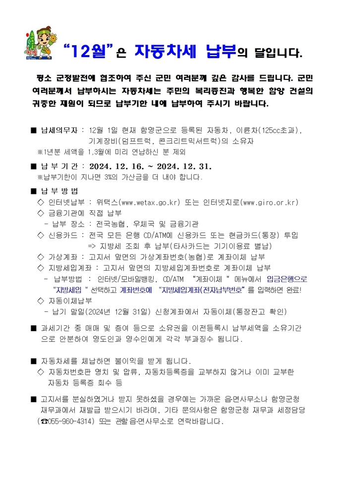 [경남도민뉴스=장광동 기자] 함양군은 2024년도 12월 정기분 자동차세 12억 6,050만 원(지방교육세 포함)을 부과하고 납세 홍보에 나섰다.
