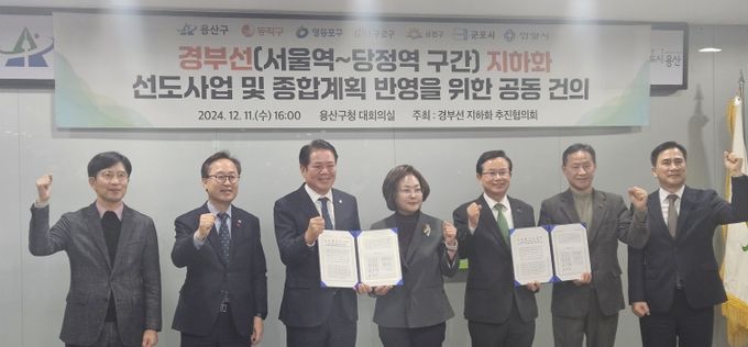 ‘경부선지하화협의회’에서는 유성훈 금천구청장을 비롯해 사업 구간을 지나는 서울 구로·동작·영등포·용산구와 경기도 안양·군포의 자치단체장 7명이 참석해 정부 선도사업 지정을 요구하는 한목소리를 냈다.