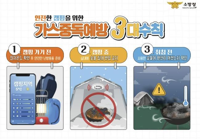 이에 소방서는 캠핑장 가스중독 사고 예방을 위해 ▲텐트 내 난방기구 사용 지양 ▲텐트 내 일산화탄소 경보기 설치 ▲화기 사용 시 텐트 밖에서 일정 거리 유지 ▲사용한 숯불은 완전히 꺼졌는지 확인 등을 안내했다.