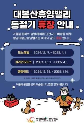 [경남도민뉴스=장광동 기자] 국내 최고의 산악형 힐링 관광지로 부상한 함양대봉산휴양밸리가 겨울철 안전사고 예방을 위해 내년 초까지 동절기 휴장에 들어간다.