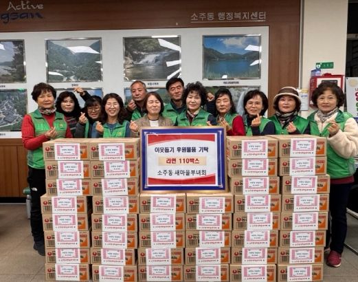 [경남도민뉴스=최미정 기자] 양산시 소주동 새마을협의회·부녀회는 지난 12일 소주동행정복지센터에 라면 110박스를 기탁하며 이웃사랑을 실천했다.