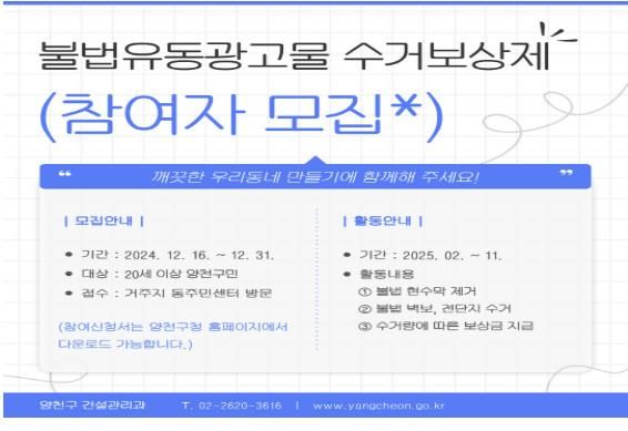 [경남도민뉴스=윤장희 기자] 양천구는 도시 미관을 저해하고 보행자 안전을 위협하는 불법 현수막·첨지류 등의 제거를 통해 쾌적하고 깨끗한 거리환경을 조성하고자 ‘2025년 불법유동광고물 수거보상제’를 운영하고, 이달 31일까지 감시단 54명을 모집한다고 밝혔다.
