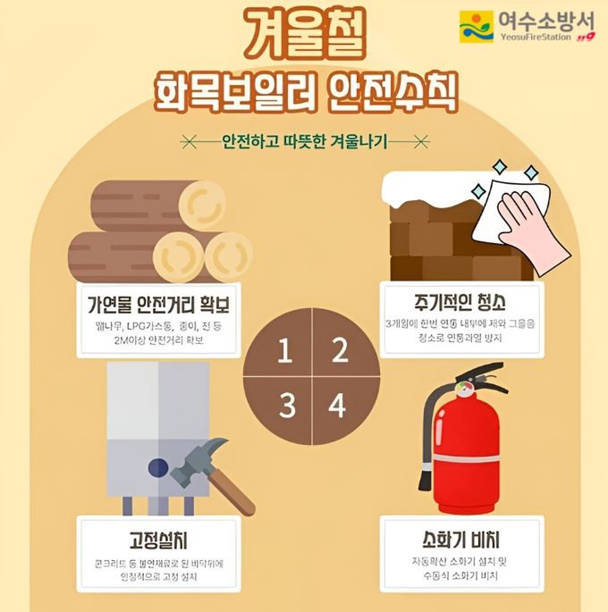 [경남도민뉴스=최인태 기자] 여수소방서는 겨울철 화목보일러 사용이 증가하는 시기를 맞아 화재 예방을 위해 시민들에게 안전수칙 준수를 당부하고 있다.