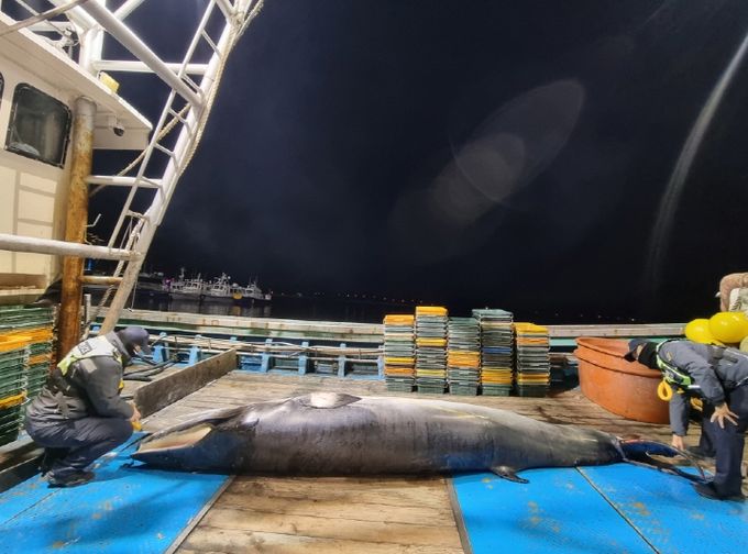 [경남도민뉴스=최인태 기자] 완도해양경찰서(서장 이영호)는 지난 16일 전남 완도군 여서도 인근해상에서 밍크고래 한 마리가 그물에 걸려 죽은 채 발견됐다고 밝혔다.